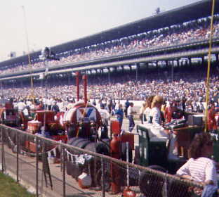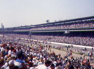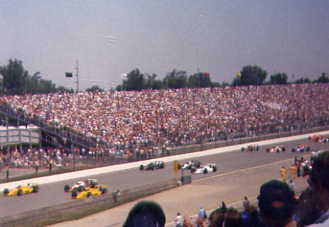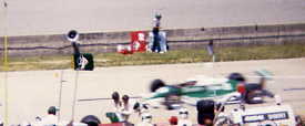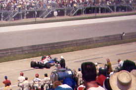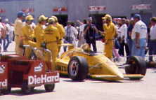 | Tom Sneva, backwards into the pits after bouncing off the outer fourth turn wall. |