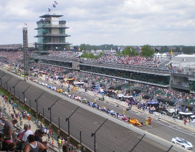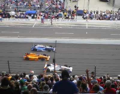 | The second starting row cars of Takuma Sato (the eventual winner), two-time world driving champion Fernando Alonso, and J.R. Hildebrand run their pace lap. |