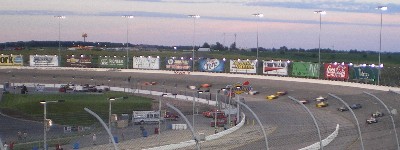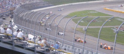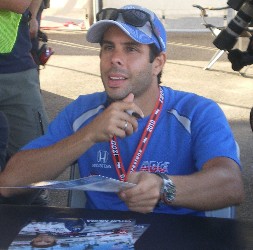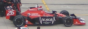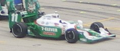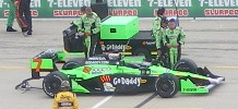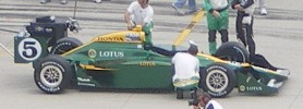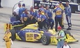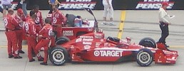 | Leaving the pits. Note that Helio Castroneves and Scott Dixon are colliding. |