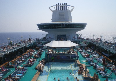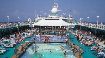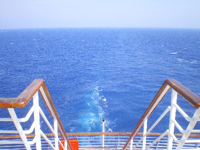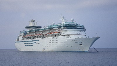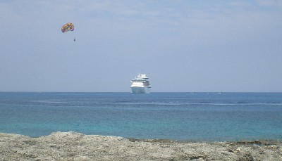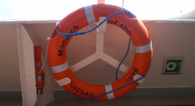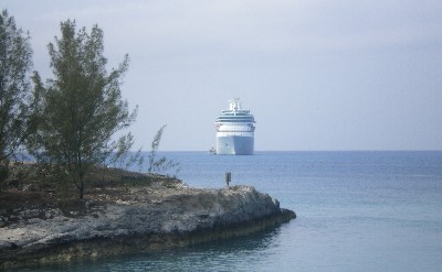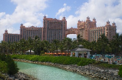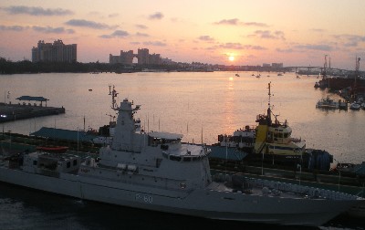 Sunrise at Nassau, with Atlantis Resort in the distance and a frigate in the foreground.