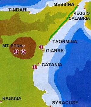 | Because of senseless religious violence in Egypt, the cruise ship stopped at Sicily instead. The land tour route is marked in green on the map. |